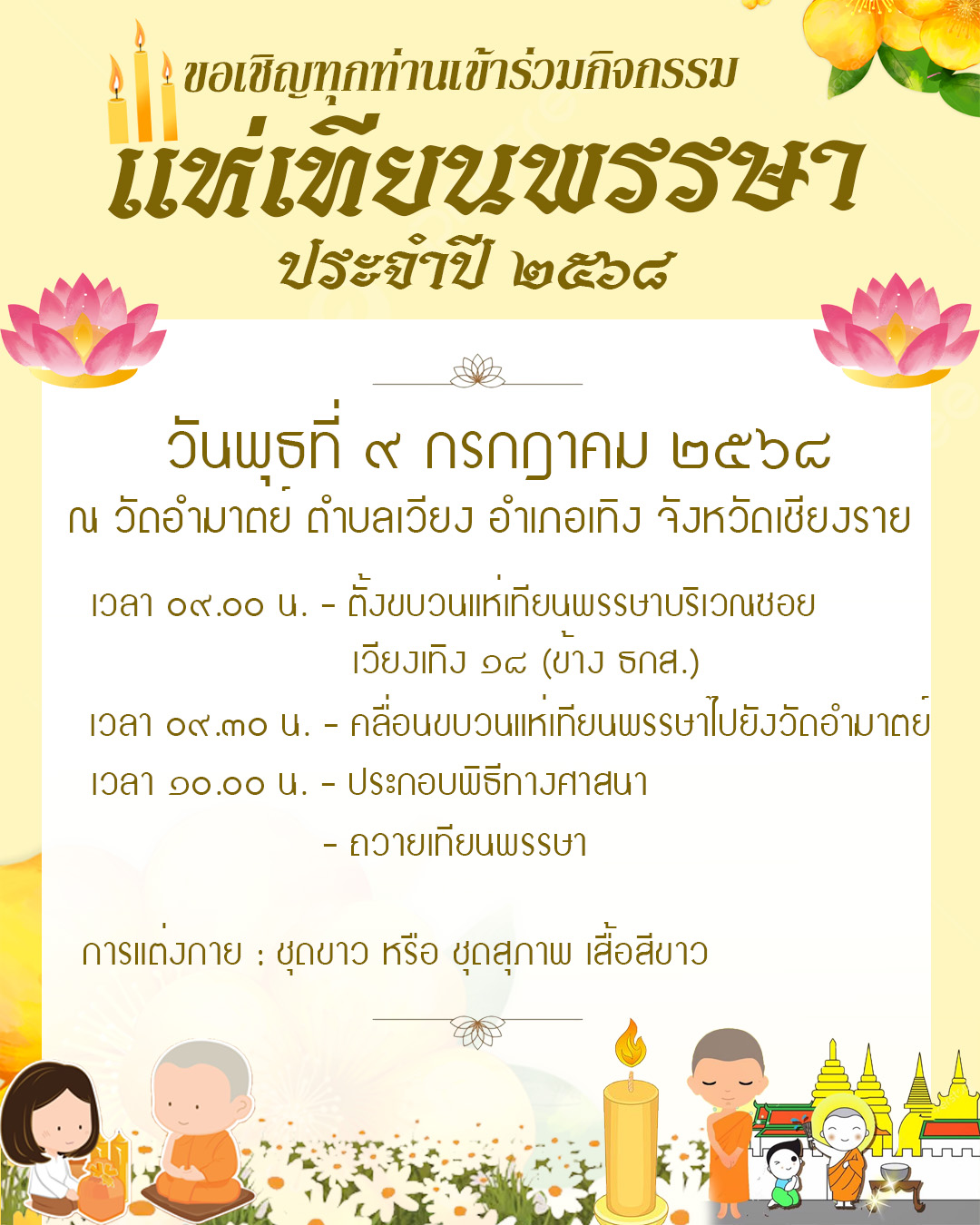 - เวลา 09.00 น. – ตั้งขบวนแห่เทียนพรรษาพร้อมขบวนรถแห่ ณ ซอยเวียงเทิง 18 (ข้างธนาคาร ธกส.)